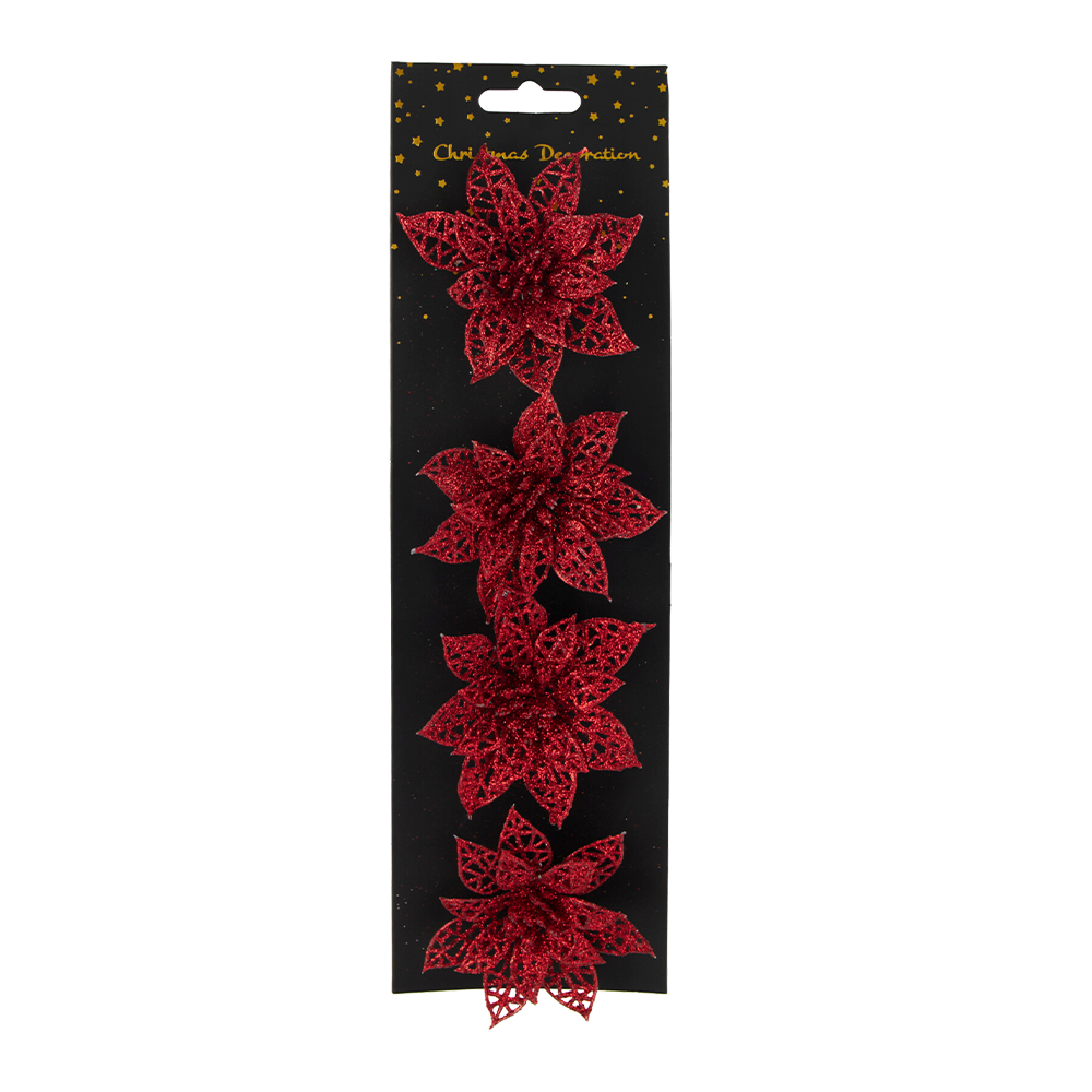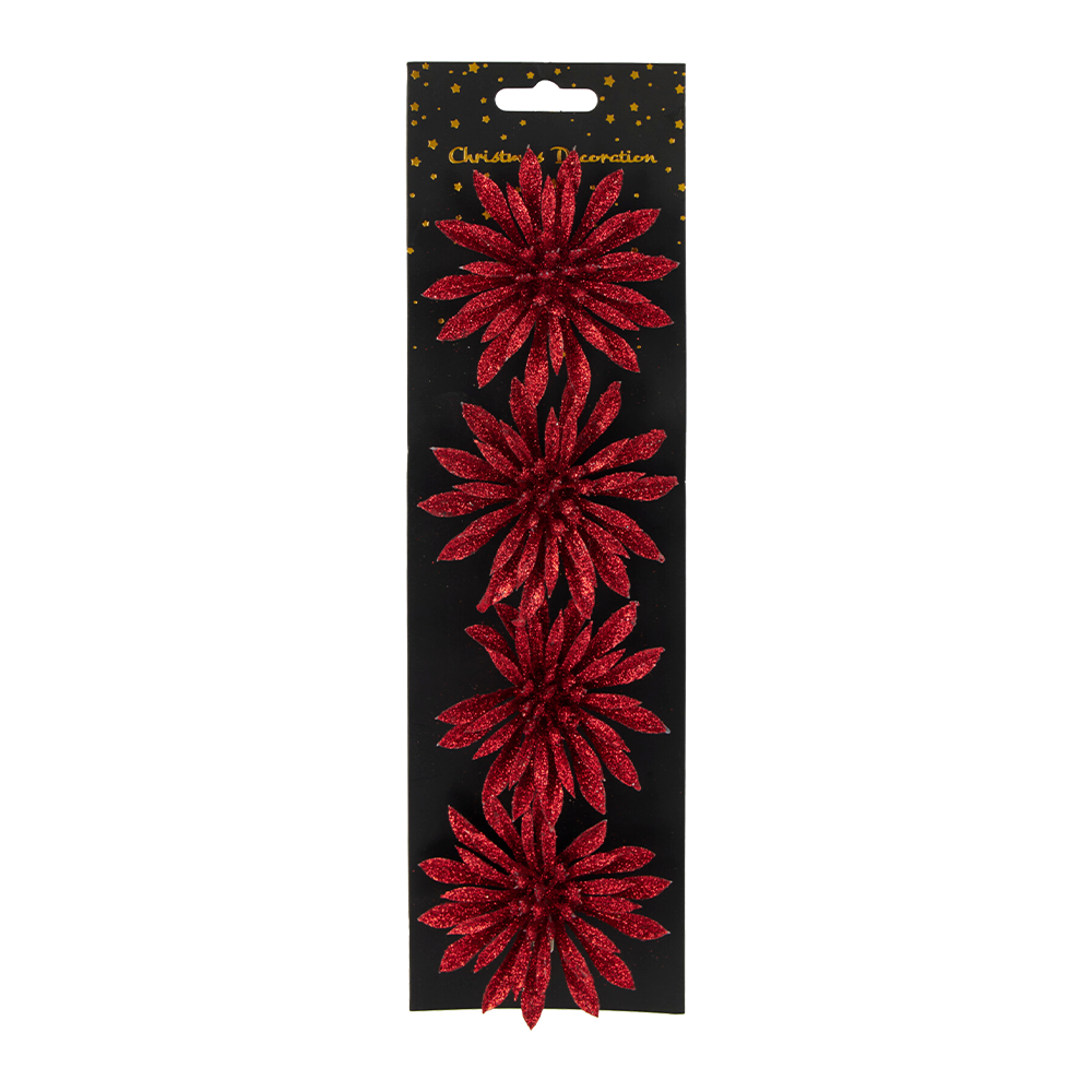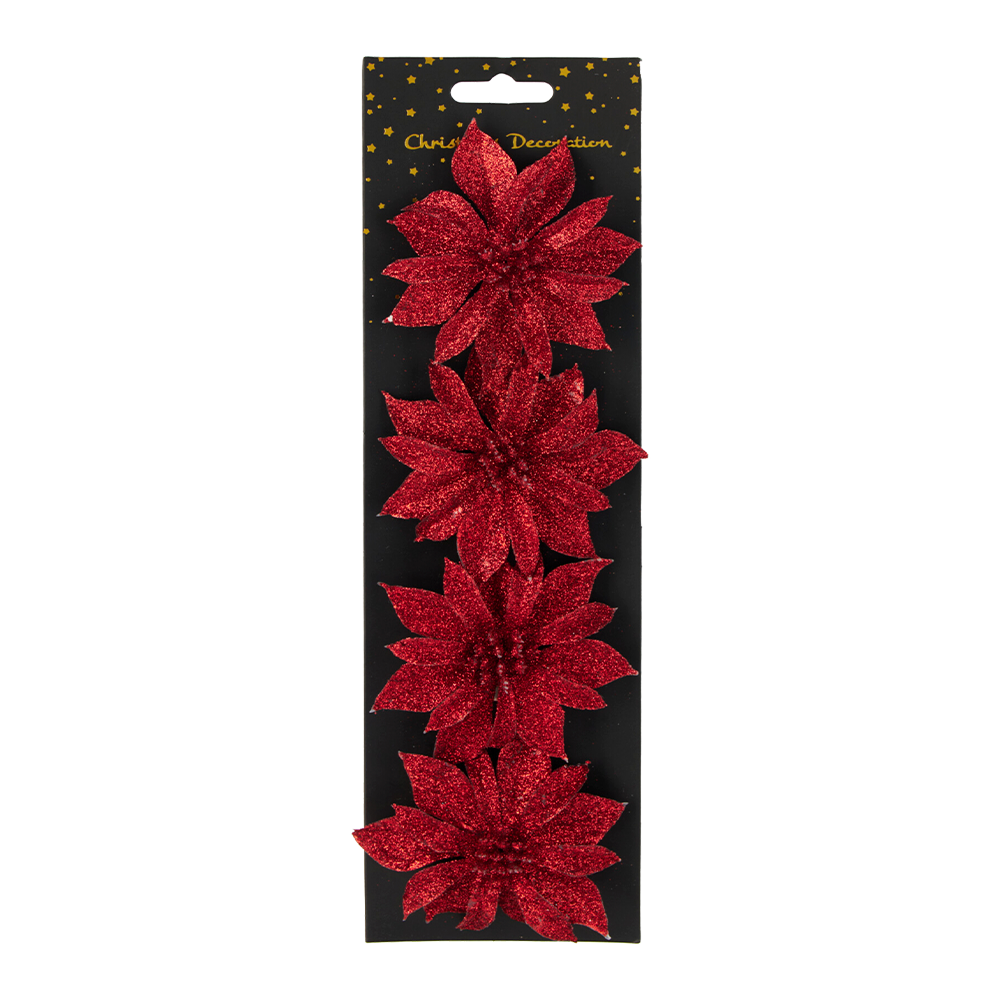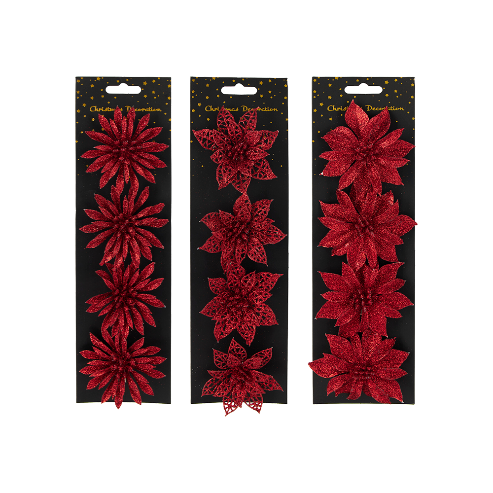 Smukke blomster på clips, der gør det nemt at pynte op til jul. Brug dem på juletræet, i kranse, dekorationer eller som pynt på gaver. De fine detaljer og praktiske clips gør dem enkle at sætte fast og genbruge år efter år.