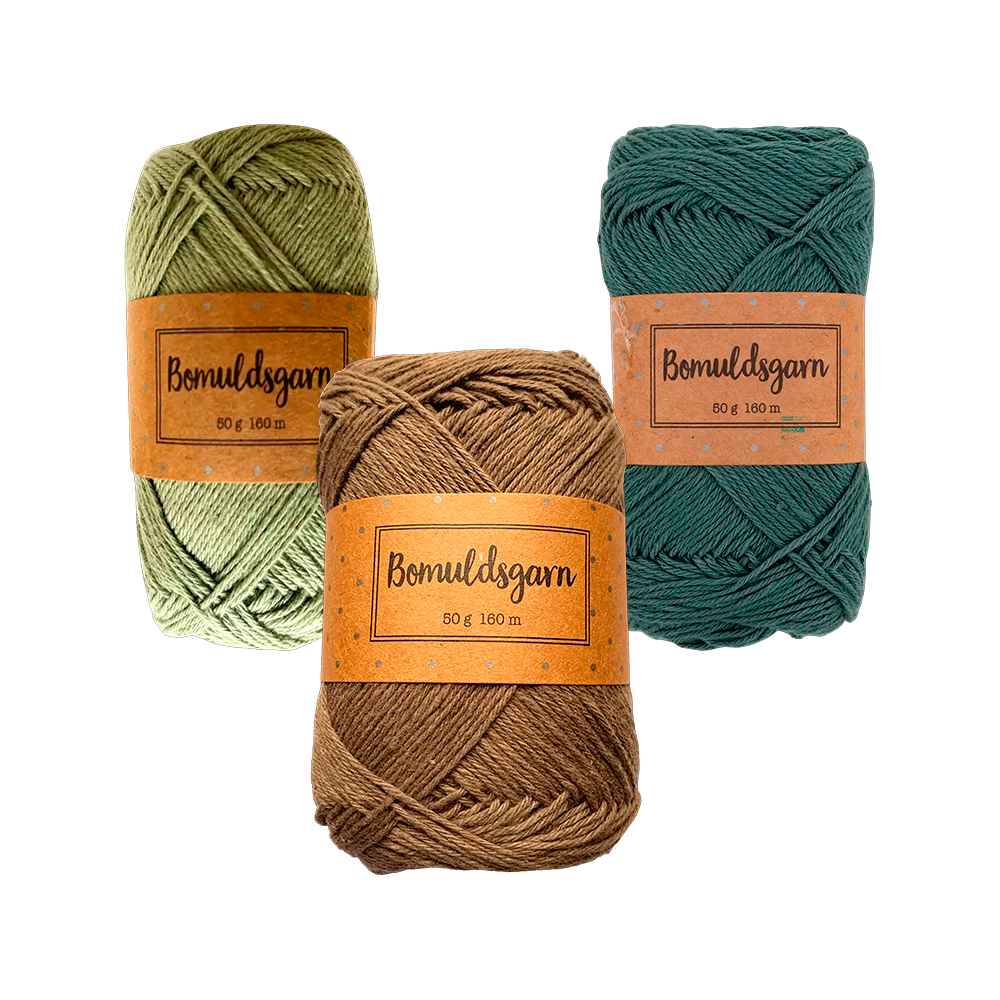 Bomuldsgarn 160 m i 3 farver: støvet grøn, mørkegrøn og valnød. 50 g. Prisen er pr. garnnøgle.