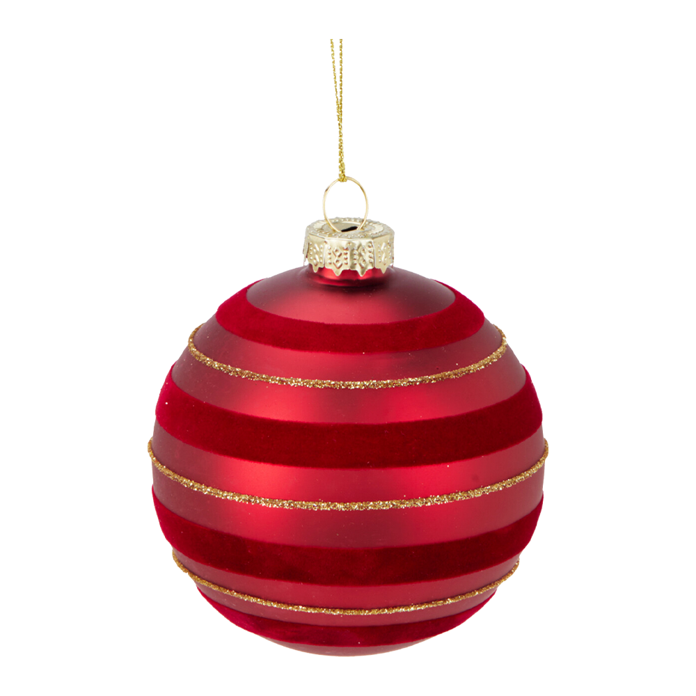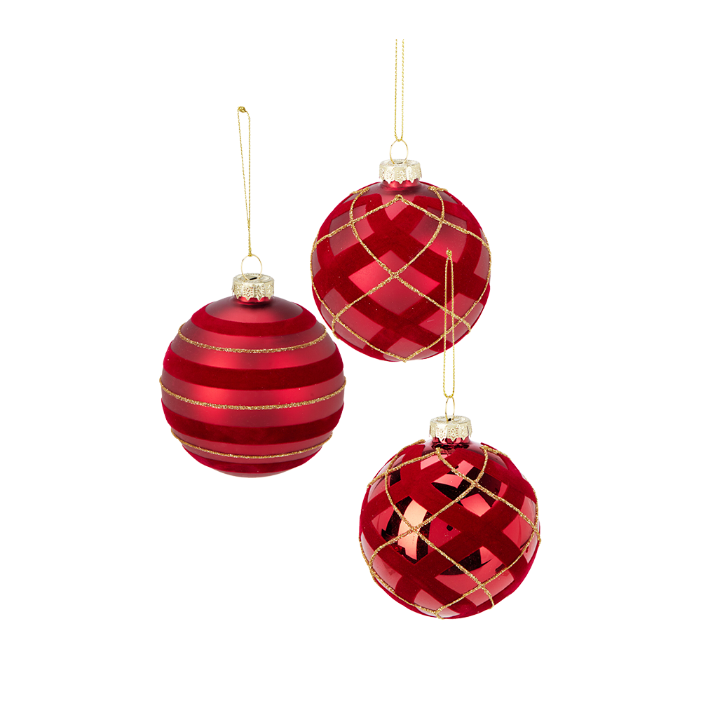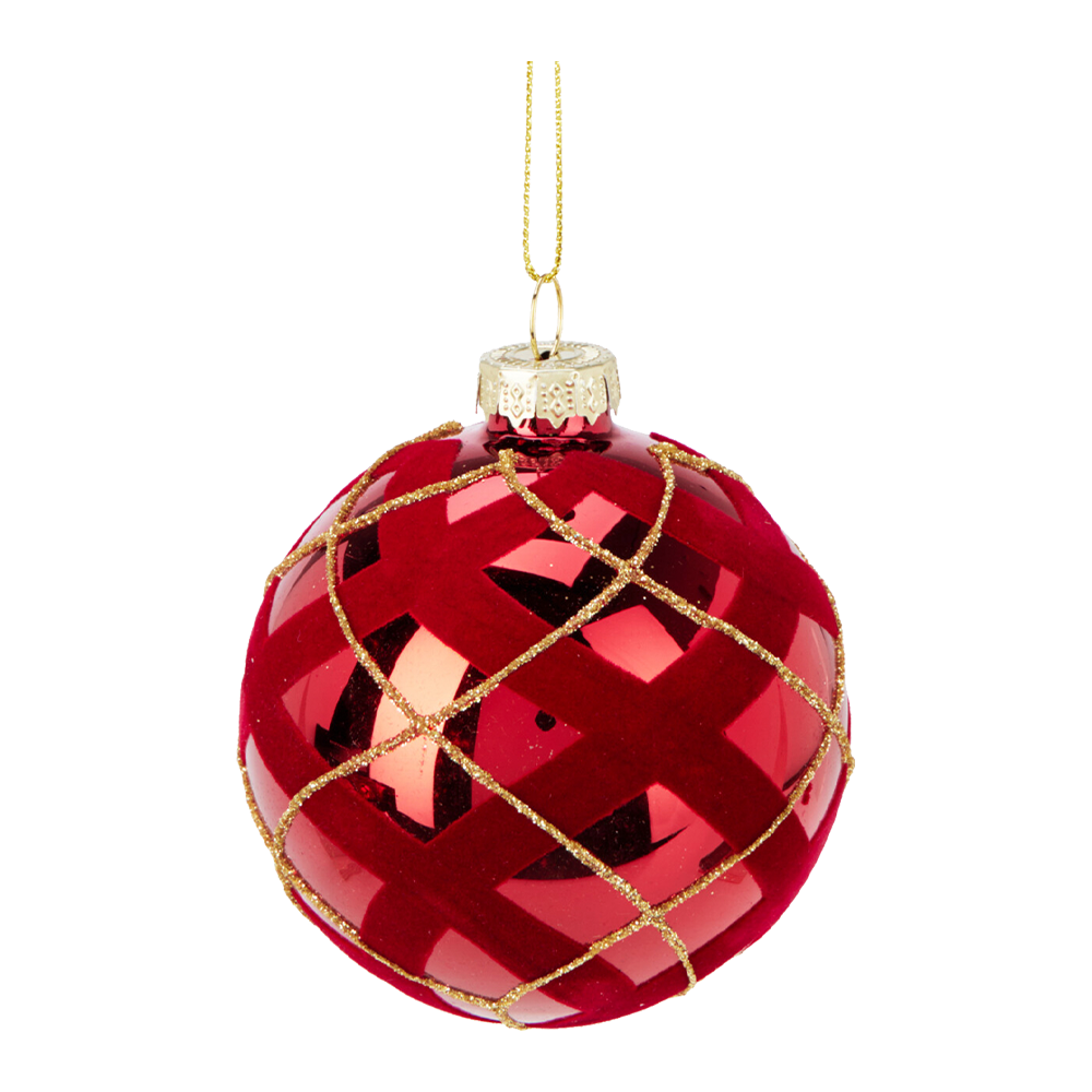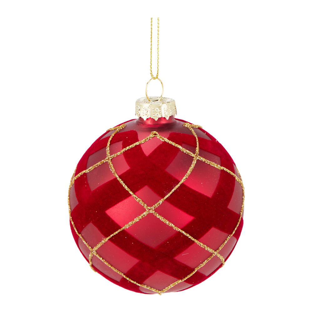 Rød julekugle med guldmønster i 4 varianter. Ø. 8 cm. Prisen er pr. stk.