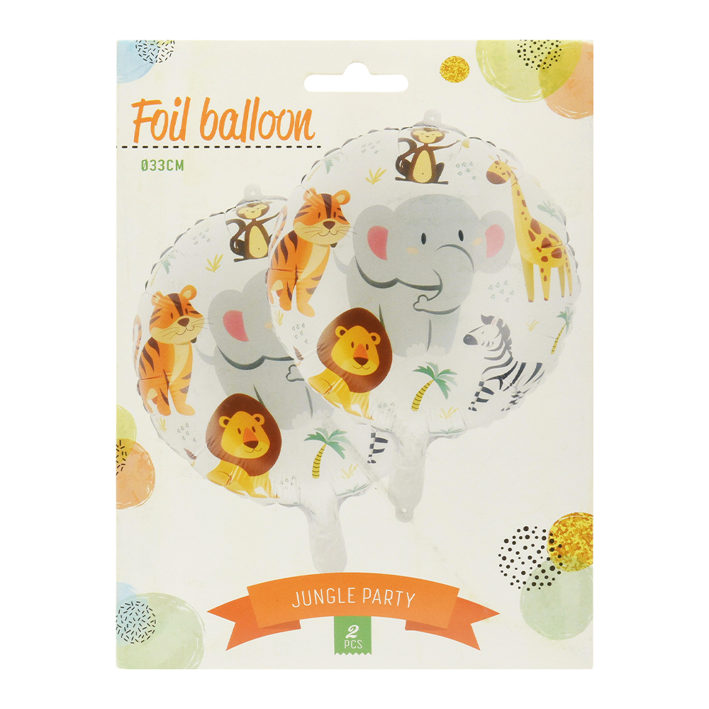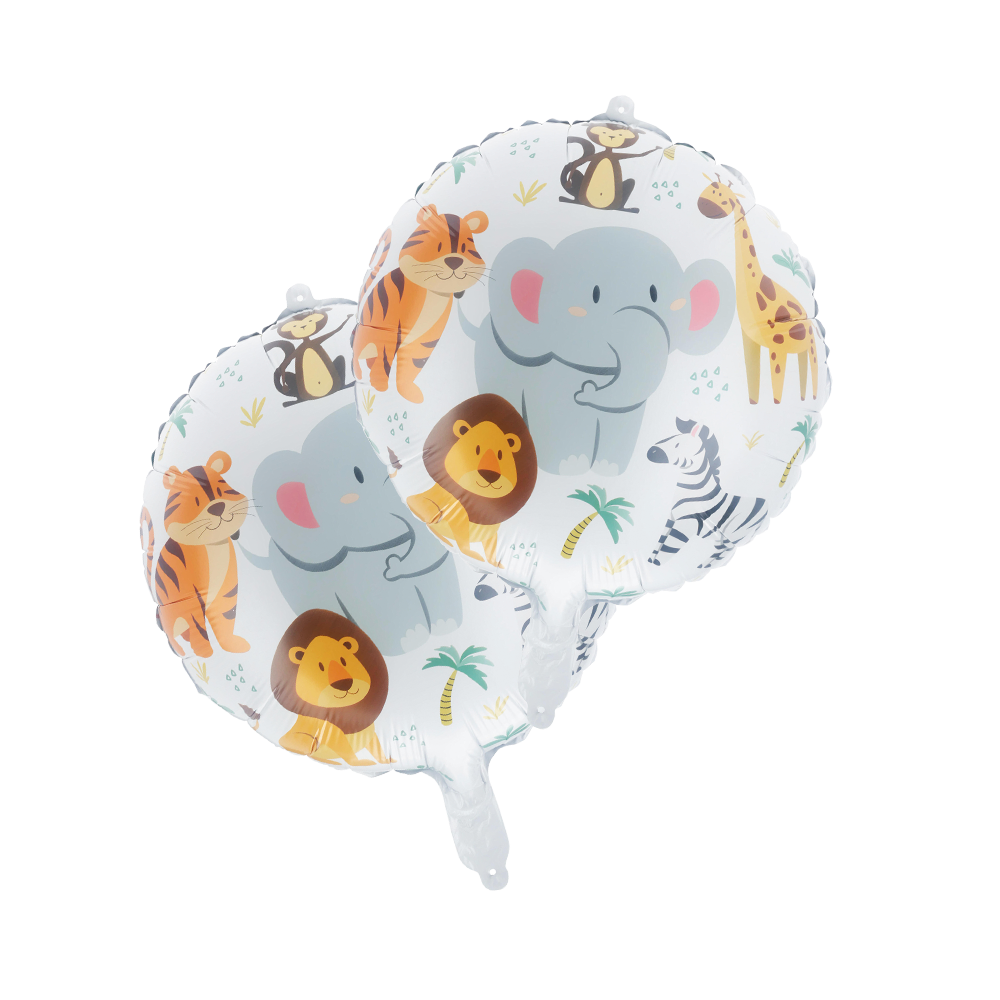Giv festen et vildt twist med disse flotte folieballoner med jungletema. Du får 2 balloner i hver pakke, begge med søde dyremotiver som løve, abe eller zebra. De er nemme at puste op og perfekte som blikfang til børnefødselsdage, temafester eller leg i hverdagen. Brug dem alene eller sammen med andre dekorationer for maksimal jungle-stemning.