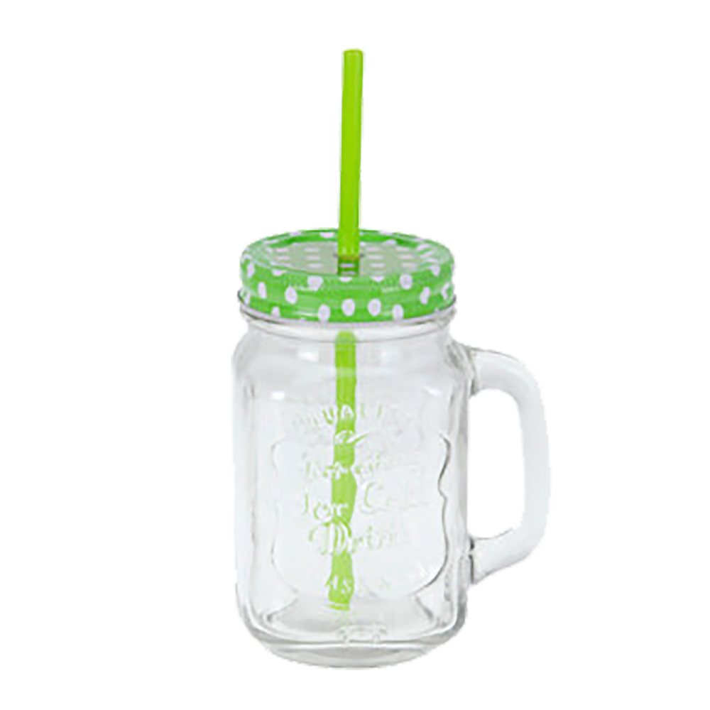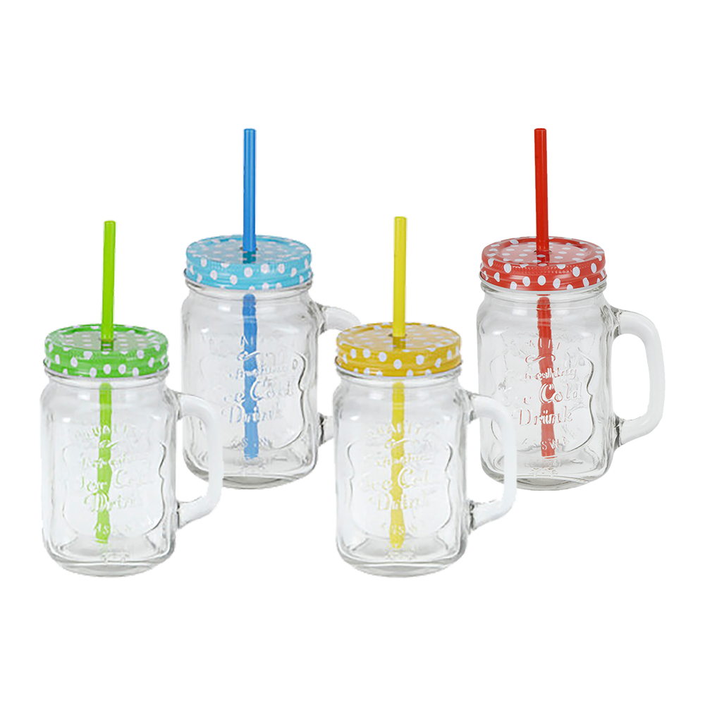 Glaskrus med hank, låg og sugerør i farverige varianter. Varen er assorteret. Prisen er pr. stk.