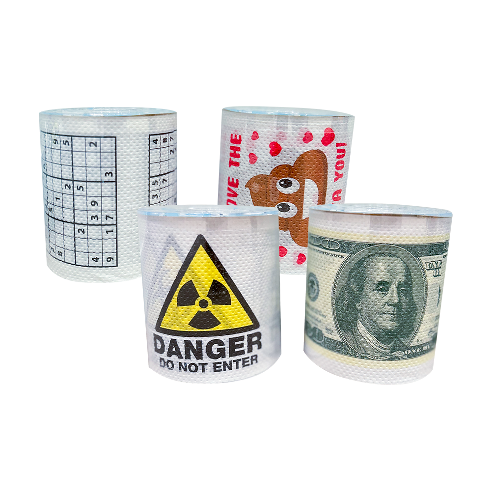 Gør toiletbesøget lidt sjovere med printet toiletpapir i fire skøre og underholdende varianter. Du kan vælge mellem en rulle med sudoku, en med advarselsmotiv, én med dollarprint eller den med kærlighed og lort. Perfekt som gave, til festen eller bare for at overraske hjemme på badeværelset. En humoristisk lille detalje, der skaber smil hos både gæster og dig selv.