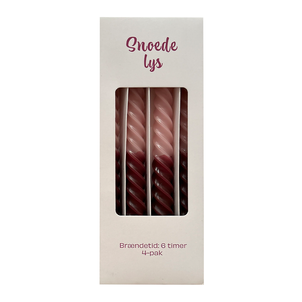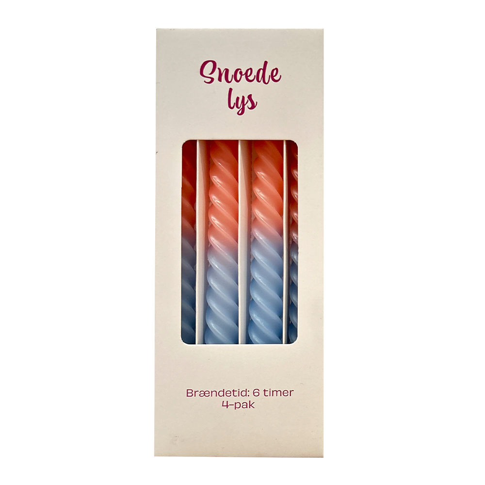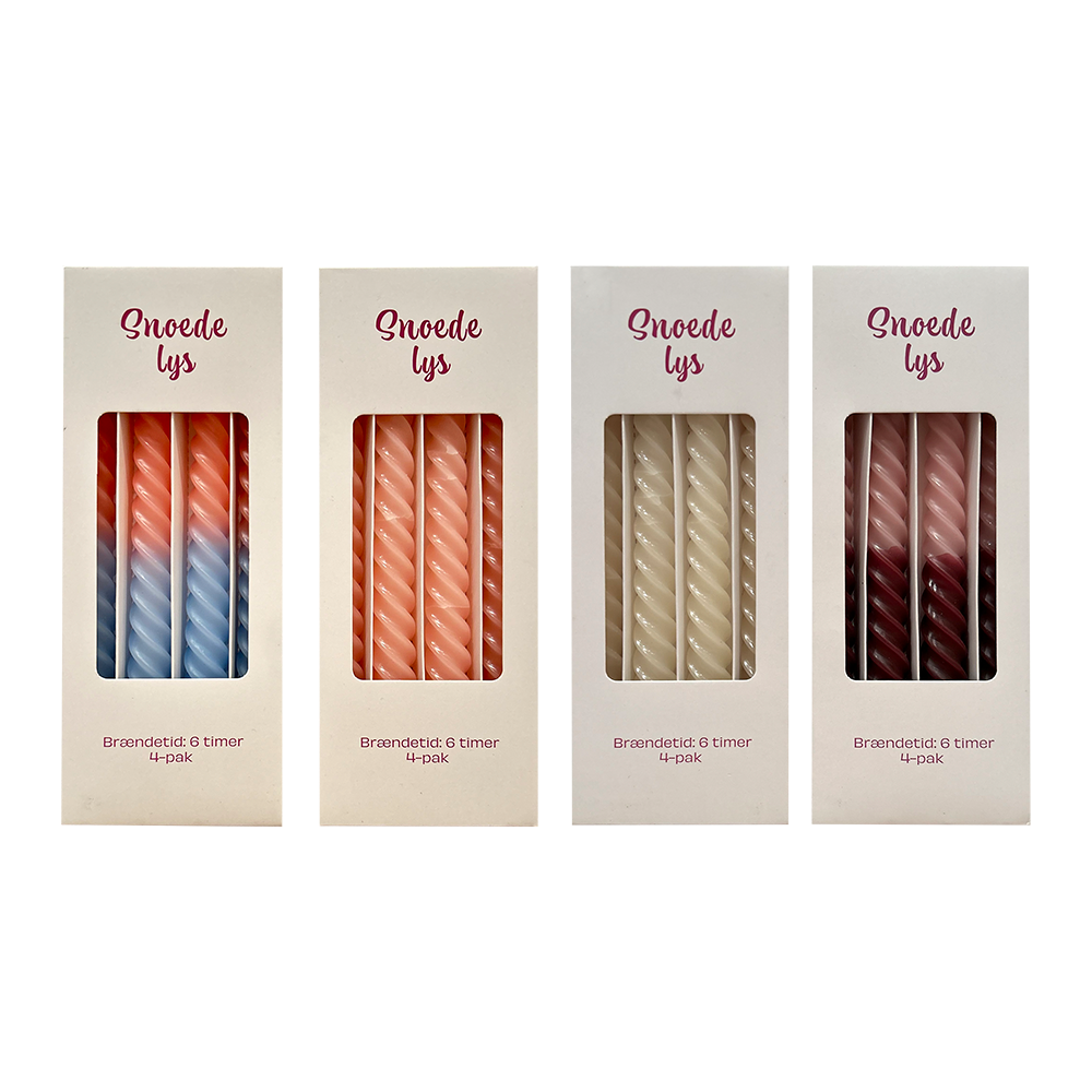 Sæt kulør på borddækningen eller hyggestunden med disse elegante snoede stearinlys. Hver pakke indeholder 4 lys i smukke nuancer og former, der giver et moderne twist på det klassiske lys. De brænder i op til 6 timer og skaber en varm og festlig stemning – uanset om det er til middag, pynt eller gaver.