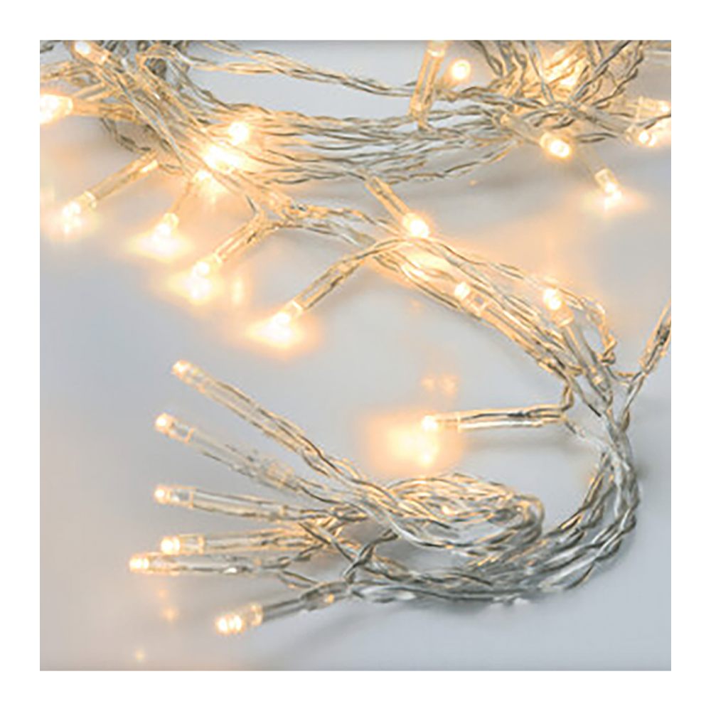 Tilføj lidt ekstra julestemning med en transparent wire med 50 farvede LED-lys. Kæden giver et levende og festligt skær, perfekt til indendørs dekorationer, vinduespynt eller julebordet. Den transparente ledning gør kæden diskret, så de klare farver træder tydeligt frem og skaber et hyggeligt udtryk.