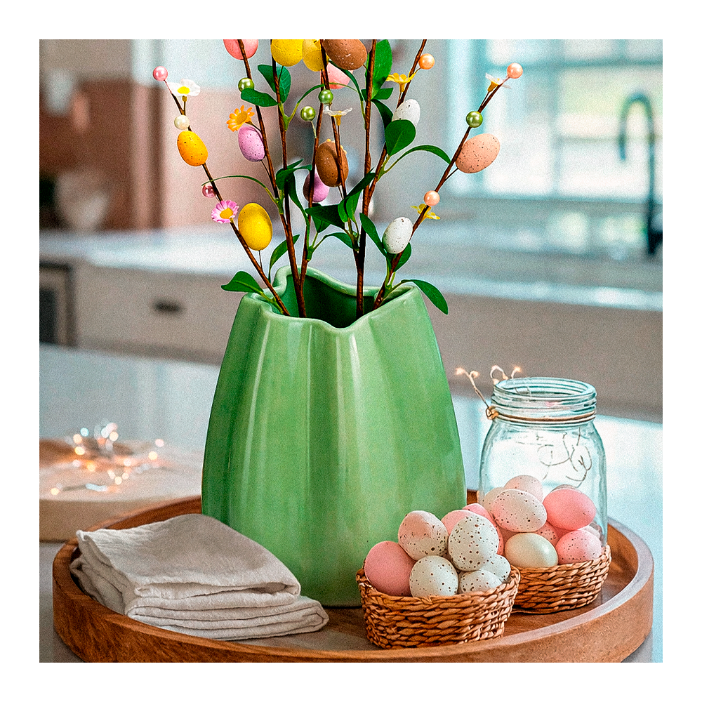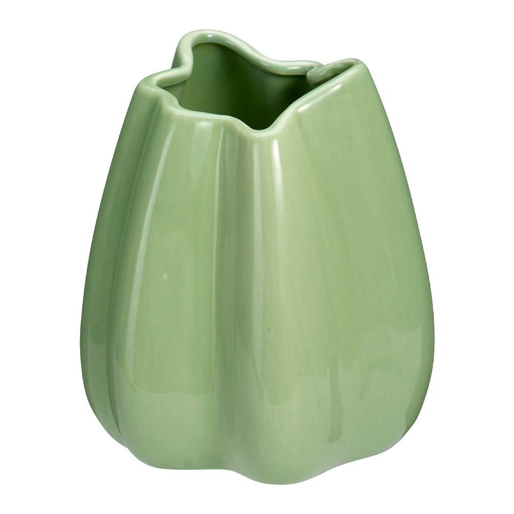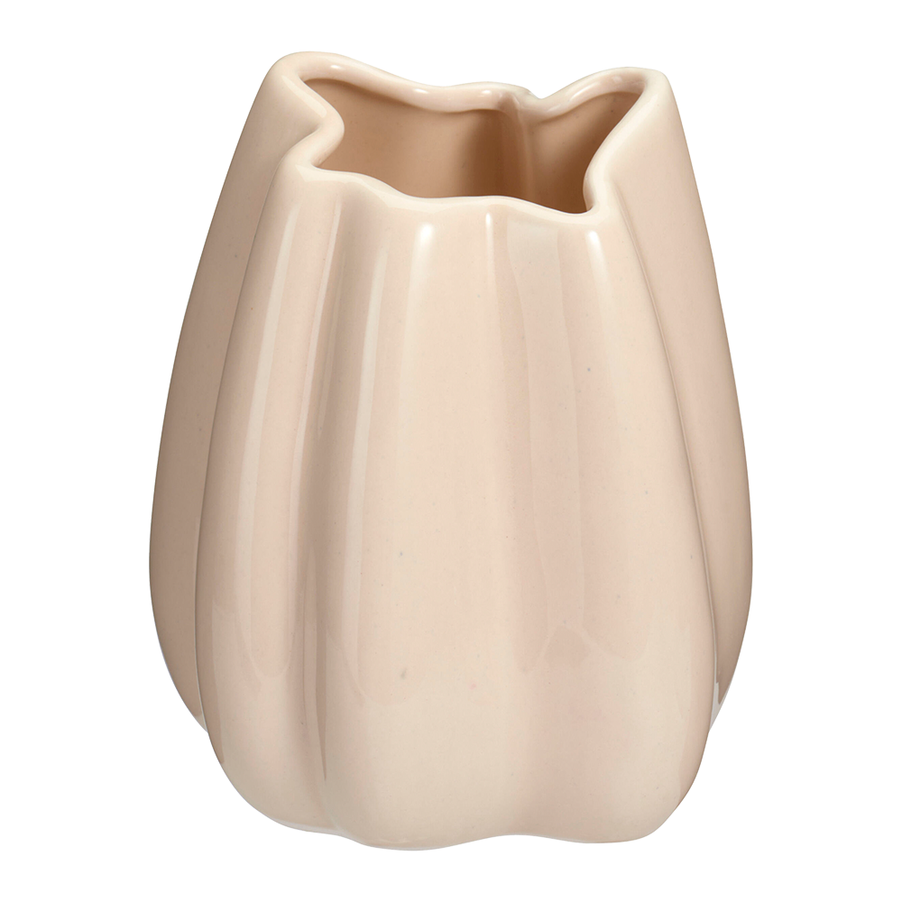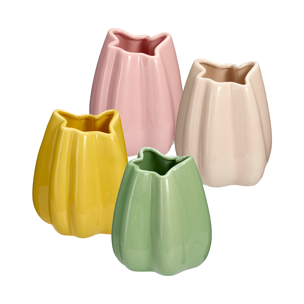 Dekorativ vase formet som en tulipan til forårs- og påskepynt. Vasen har et blødt, organisk udtryk og fås i 4 assorterede farver, som giver et let og farverigt indslag i indretningen. Velegnet til mindre buketter, enkelte stilke eller som dekorativ figur i sig selv. I farverne: beige, gul, grøn og pink. 12 x 11,5 x 13,5 cm. Vægt 520 g.