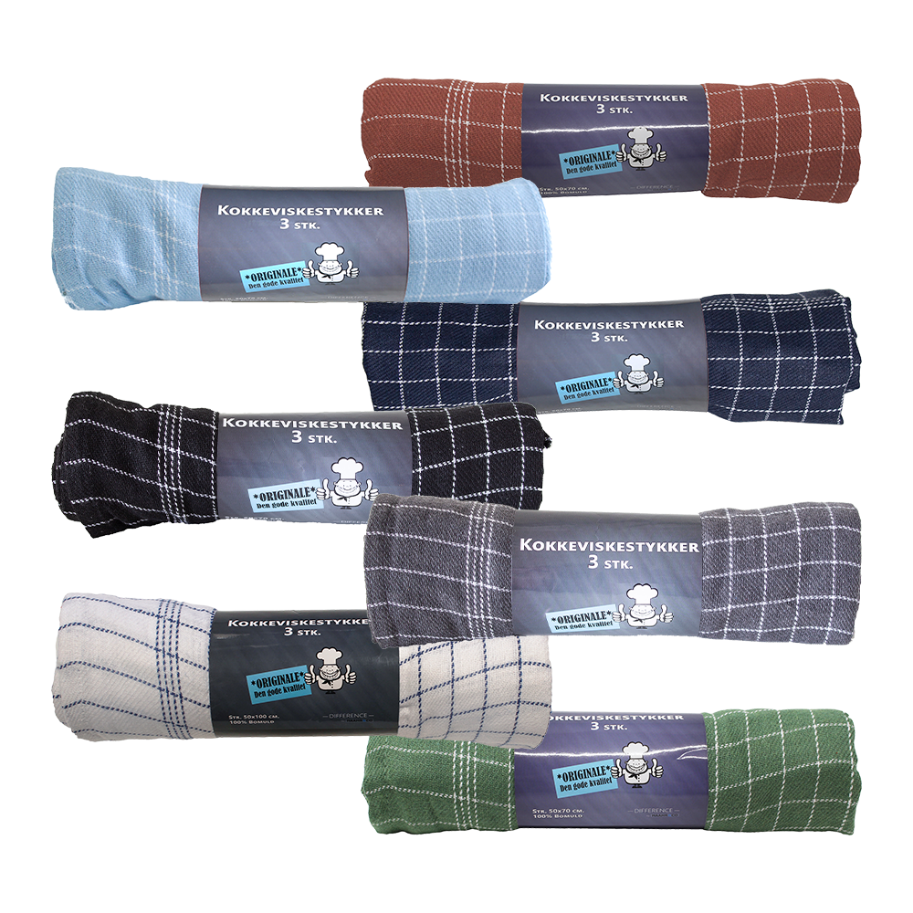 Viskestykker i 100 % bomuld med klassisk ternet mønster og god absorberingsevne. Perfekte til daglig brug i køkkenet. Måler 50×70 cm. Prisen er pr. pakke.