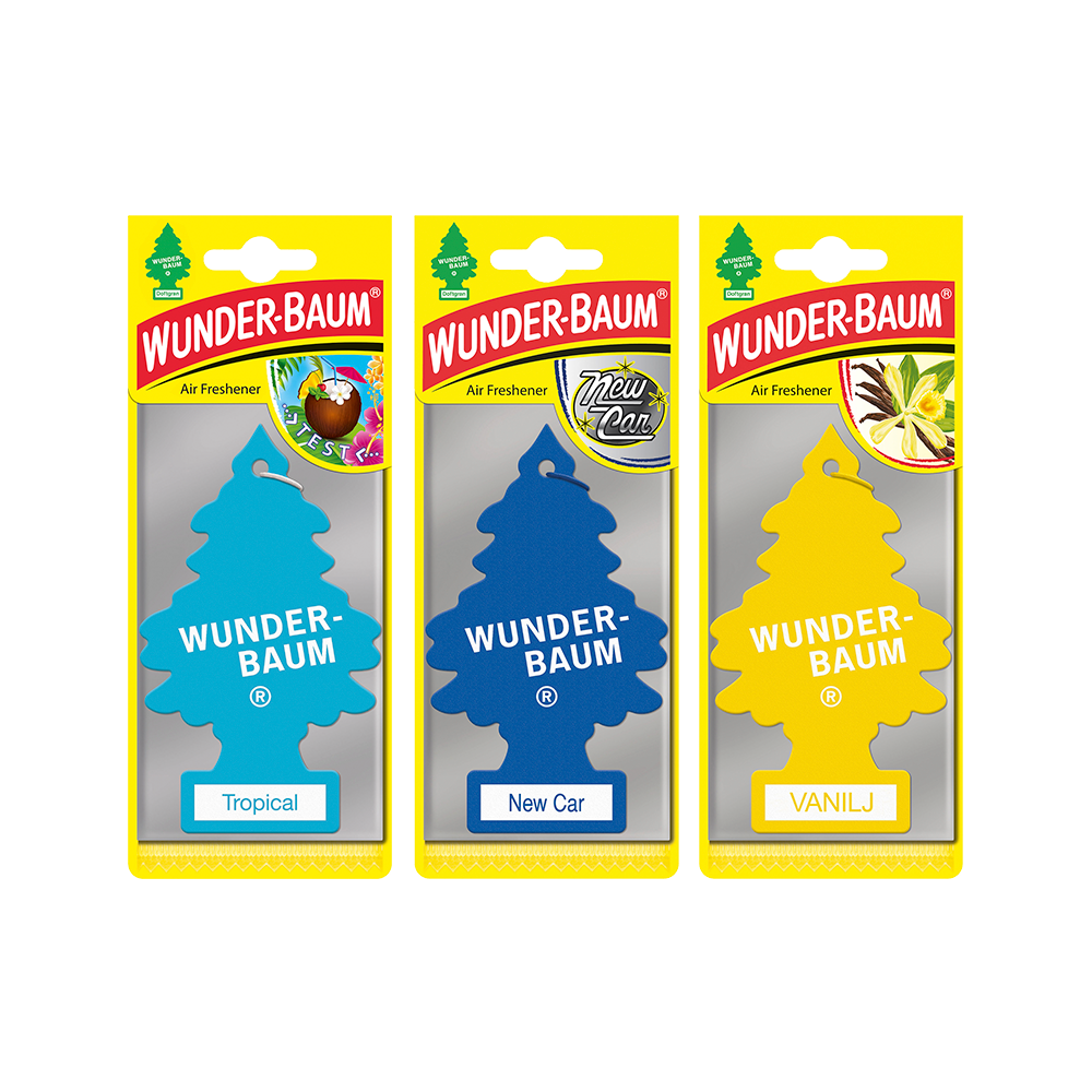 Tilføj en behagelig duft til bilen, skabet eller entréen med en klassisk Wunderbaum. Den ikoniske træform fås her i tre populære varianter: New Car, Vanilje og Tropical. Nem at hænge op og effektiv til at friske luften op i små rum. Et must-have til bilen eller hvor end du trænger til et pift af friskhed.